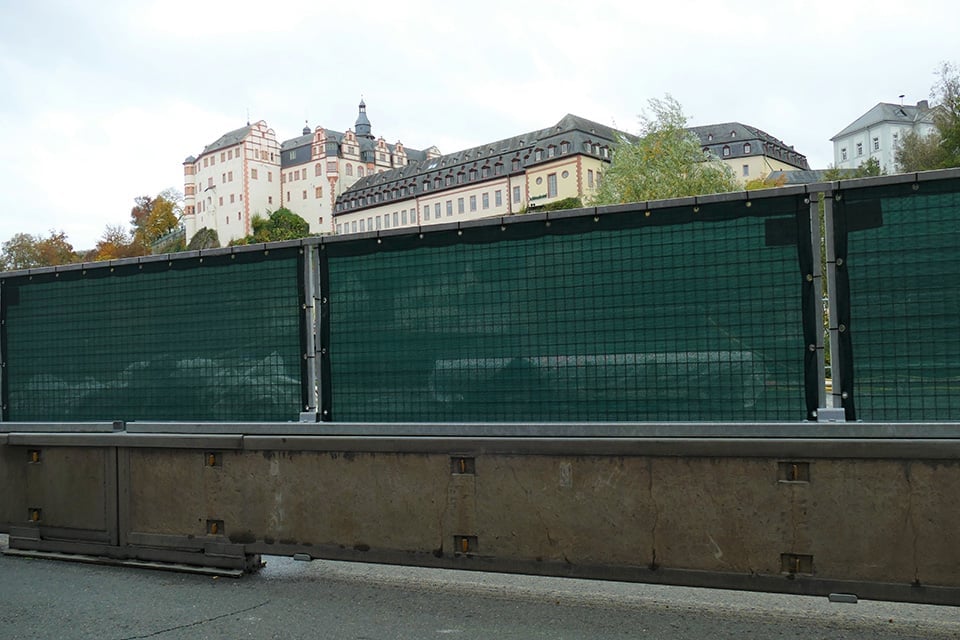 Rollender Verkehr wird nicht von den hinter dem Sichtschutz stattfindenden Arbeiten abgelenkt.