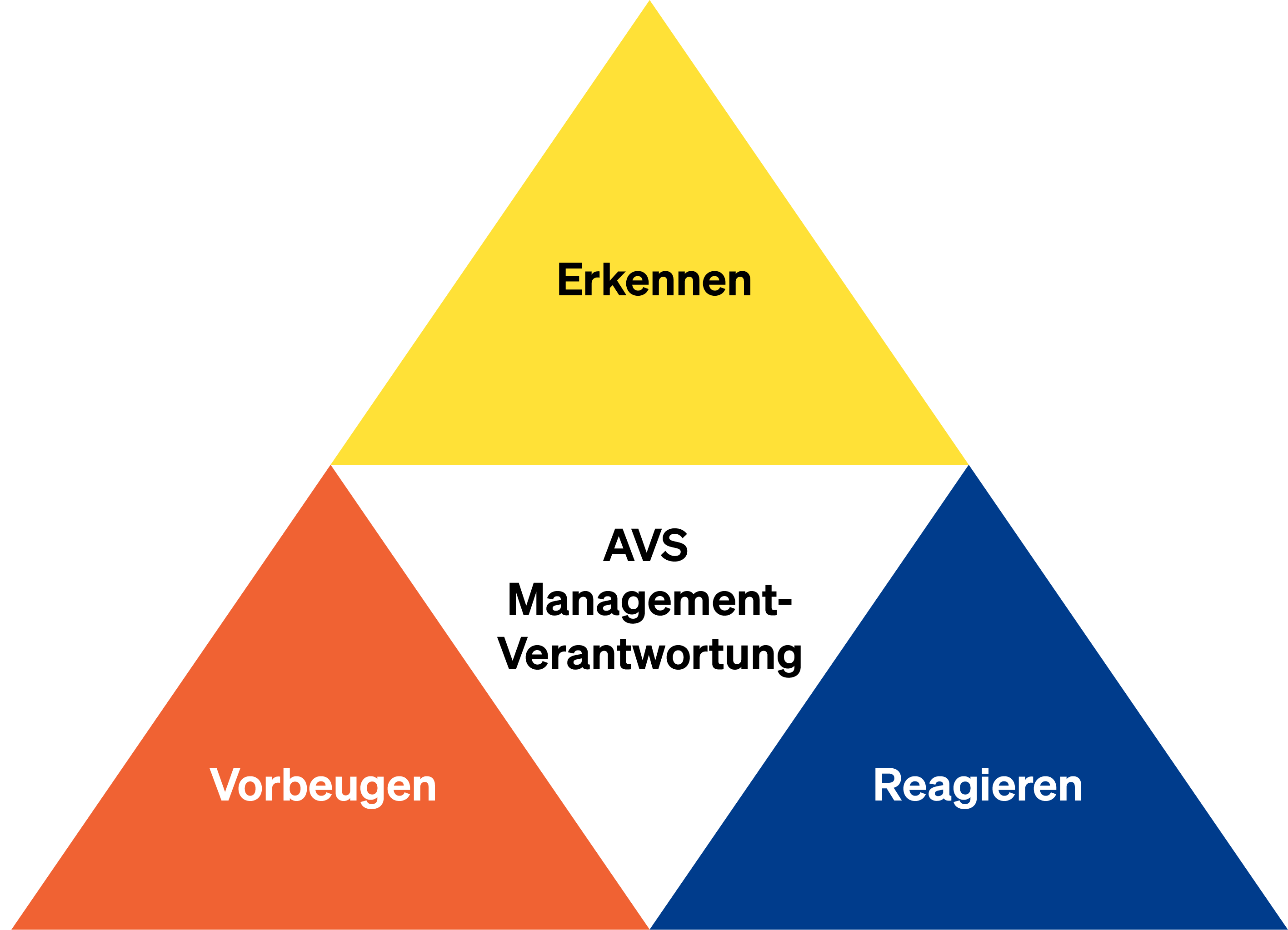 Die grundlegenden Leitsätze und Richtlinien der AVS-Gruppe sind in unserem verbindlichen Verhaltenskodex verankert. Er ist die Wertebasis unseres Tuns und sensibilisiert für potenzielles Fehlverhalten. Das AVS-Management sieht seine Verantwortung auf den drei Ebenen des AVS-Compliance-Managementsystems:
